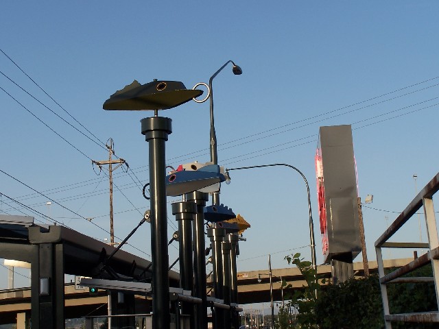 area. Several large metal lures on the station roof turn in the wind.
